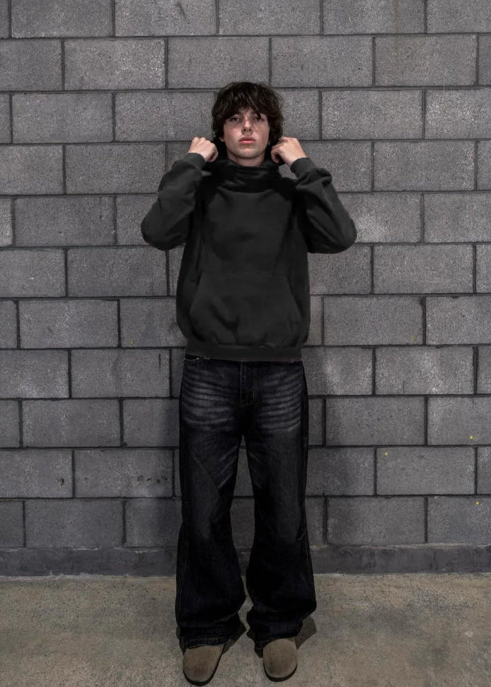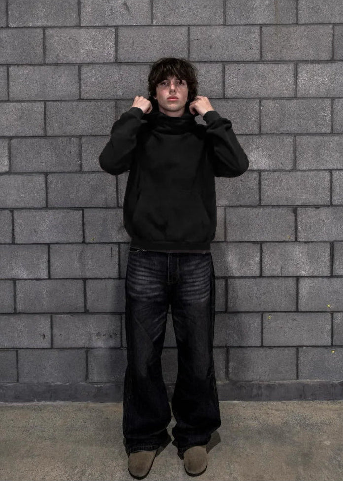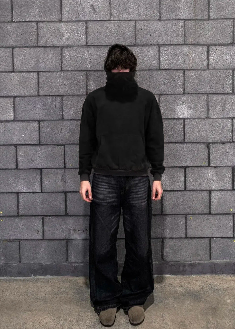 This masked-collar hoodie features a unique, high-rise wrap design that functions like a built-in face cover, paired with a washed finish and an oversized streetwear fit; crafted from heavyweight fleece for warmth and structure, it delivers a bold, modern aesthetic without trying too hard — a statement piece made for anyone who wants to stand out, quietly.